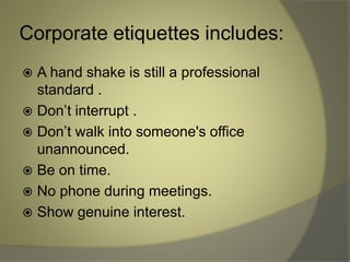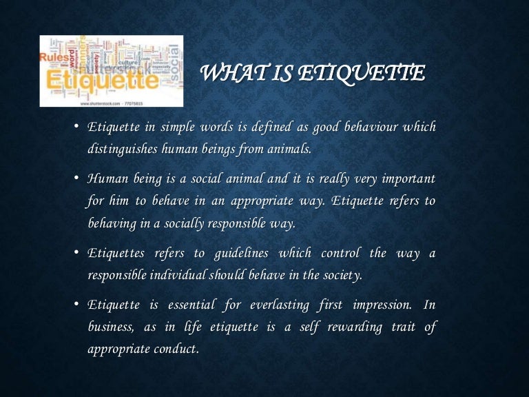 › corporateCorporate Etiquette - Dos and Donts Etiquette refers to good manners which help an individual leave his mark in the society. An individual must know how to behave at the workplace. There is a huge difference between college and professional life. One needs to be disciplined at the workplace. Corporate Etiquette refers to set of rules an individual must follow while he is at work ... › us › enWhat is Netiquette? A Guide to Online Ethics and Etiquette ... A Guide to Online Ethics and Etiquette Netiquette is a combination of the words net work and etiquette and is defined as a set of rules for acceptable online behavior. Similarly, online ethics focuses on the acceptable use of online resources in an online social environment.