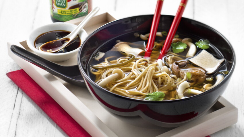 Nouilles japonaises dans un bol de soupe, 3 recettes facile Comment faire des nouilles japonaises au poulet. Mélanger 700 ml de poulet, 3 gousses d'ail, sauce soja, 1 cuillère à café de sauce Worcestershire, le gingembre, l'origan, la poudre de chili et 300 ml d'eau dans une casserole à feu moyen, réduire le feu et laisser cuire le mélange pendant 5 minutes.