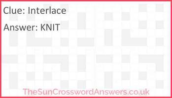Interlace crossword clue - TheSunCrosswordAnswers.com While searching our database we found 1 possible solution for the: Interlace crossword clue. This crossword clue was last seen on 18 April 2022 The Sun Coffee Time Crossword puzzle. The solution we have for Interlace has a total of 4 letters. Answer 1 K 2 N 3 I 4 T Related Clues We have found 4 other crossword clues with the same answer.